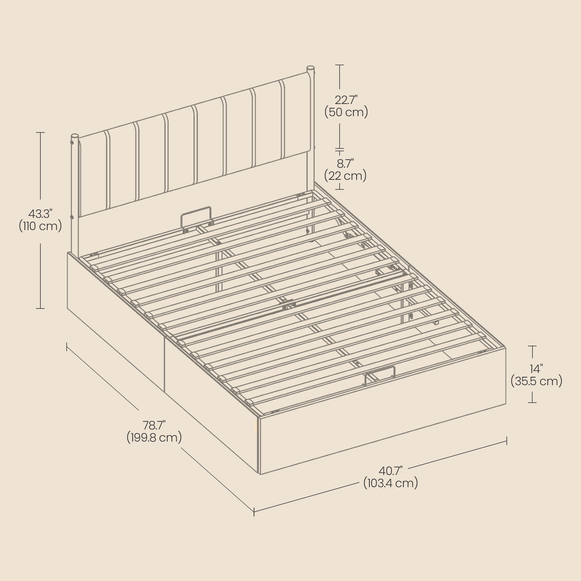This twin-size storage bed frame efficiently combines space-saving design with modern functionality. It features a reliable hydraulic lift system that effortlessly raises up to 110 lbs, granting convenient access to a generous 12.5-inch high underbed storage area. Constructed with a durable powder-coated steel frame and quiet wooden slats, it provides stable support for up to 550 lbs without a box spring. The upholstered headboard offers comfortable cushioning for daily use, while the snap-on slats and clear instructions ensure quick and simple assembly for immediate use.