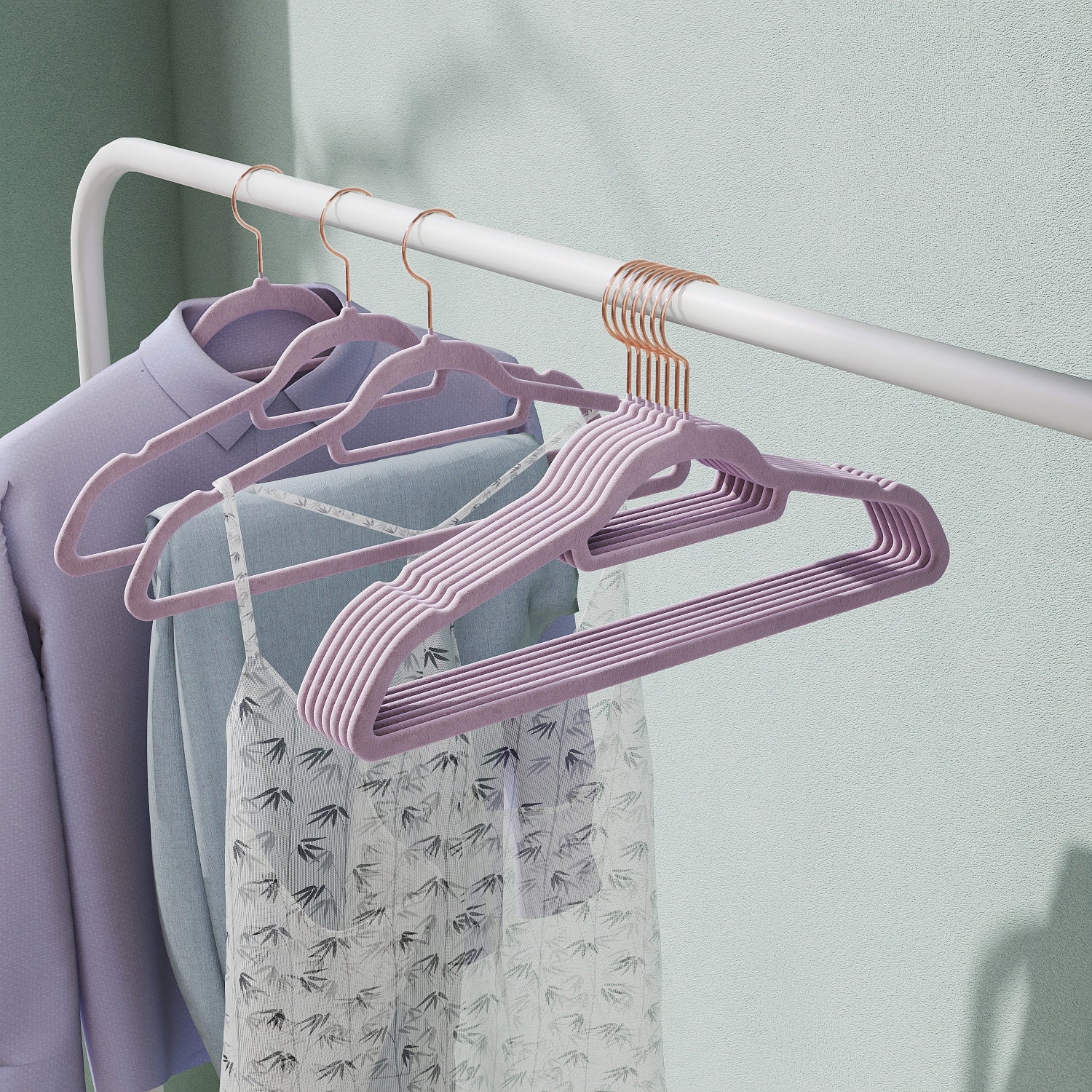 Velvet Hangers, 50-Pack Non-Slip Swivel Hook Clothes Hangers for Coat, Shirt, Dress, Pants - Slim & Space-Saving, Rose Gold Hook, Lavender Purple